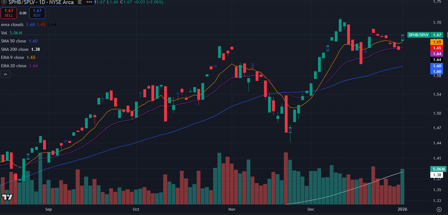 The high beta vs low beta ratio is breaking trend—breaking down below the moving averages, with technical signals rolling over.