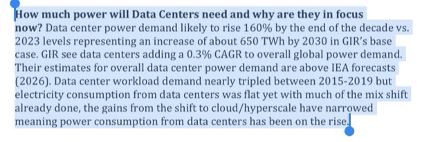 - Comparison with IEA Forecasts: The forecasts from Goldman Sachs Investment Research (GIR) are more aggressive than those of the International Energy Agency (IEA), suggesting a more rapid increase in power demand for data centers. This discrepancy highlights differing assumptions about technological advancements and market growth rates.