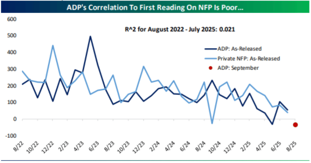 But context matters. ADP has always been noisy, with limited correlation to the official BLS report.