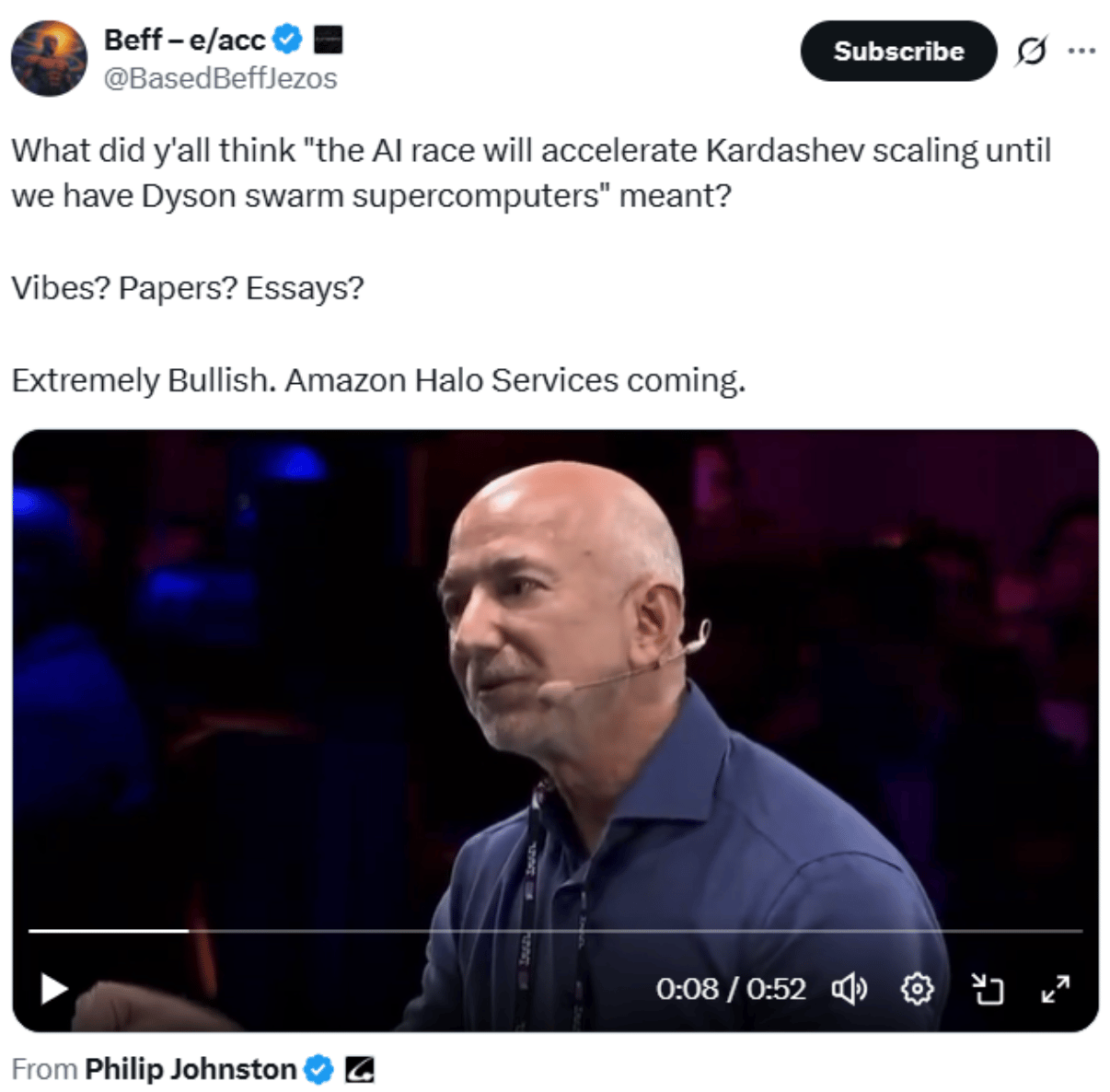 If launch costs and on-orbit assembly keep sliding, Bezos sees batch training migrate off-planet in the next 10/20 years.
