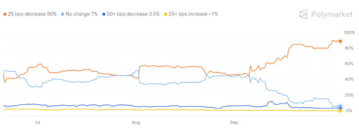 However, with FOMC members speaking on Tuesday, and no NFP print this week, the case for October cuts is strengthening. Polymarket odds are at 93% now.