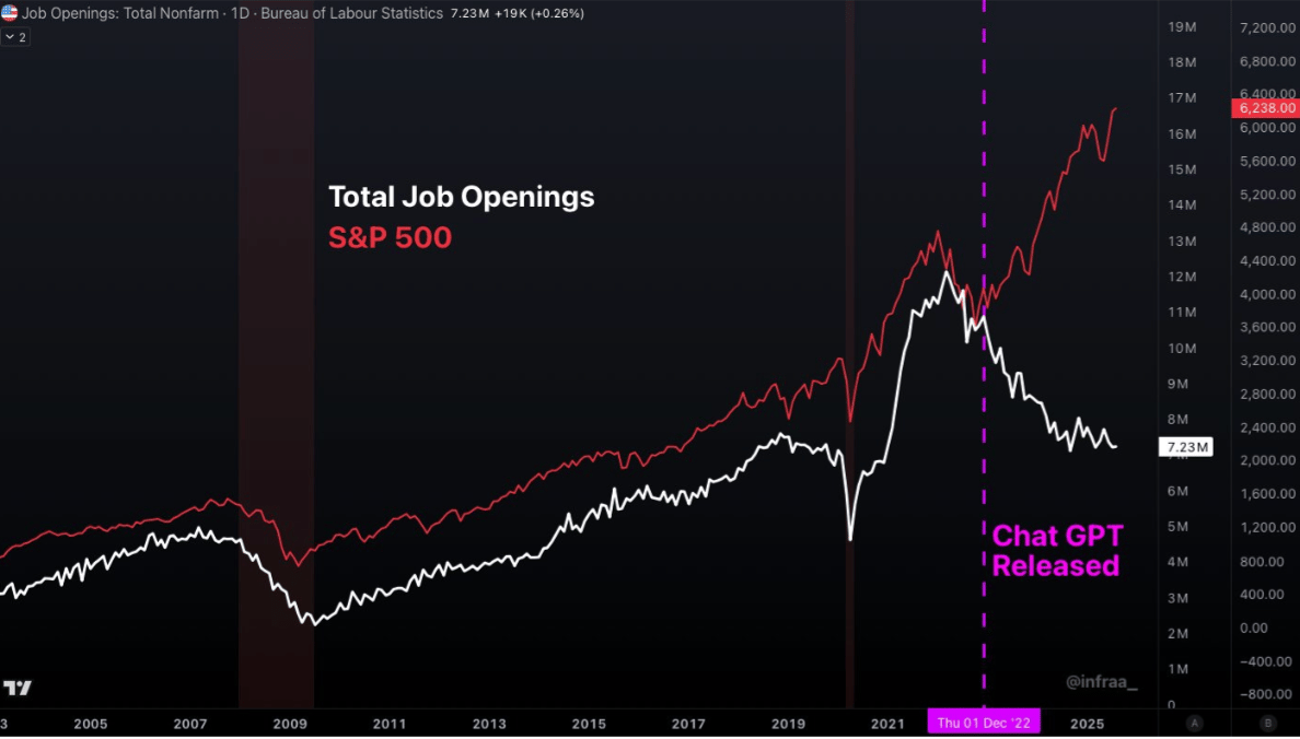 Companies don’t need to hire aggressively to sustain output. Productivity gains, driven by automation and AI, are reducing the need for incremental labor. In effect, output is decoupling from headcount.