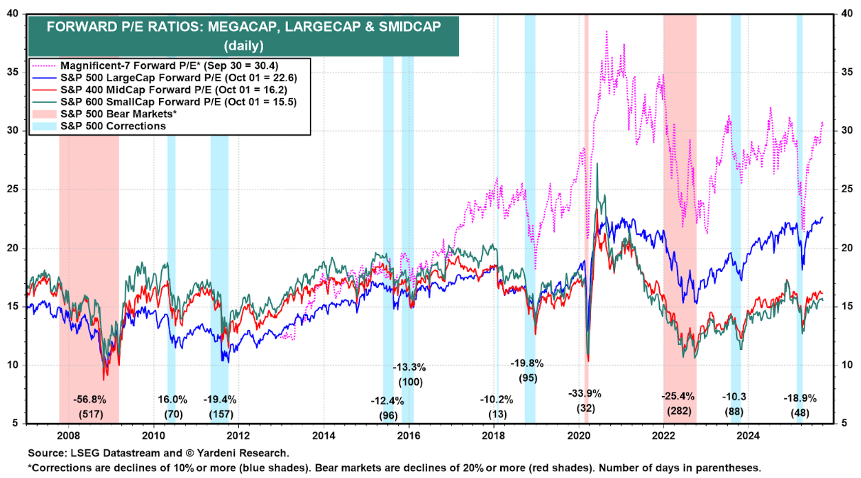 Leaders (Mag 7) with pricing power and network effects carry the premium; The small and mid caps still trade at humble valuations of 15-16x.