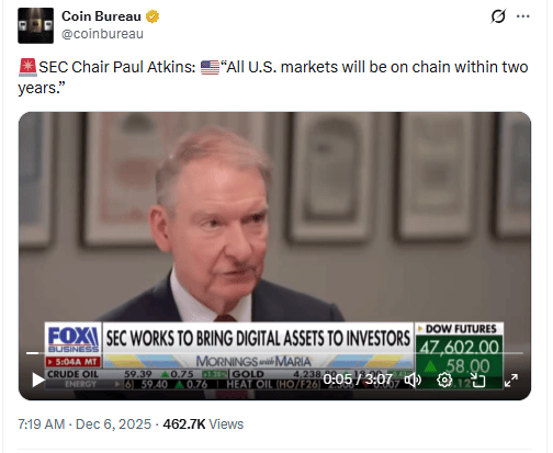 SEC Chair Paul Atkins forecasts “All U.S. markets will be on chain within two years.”