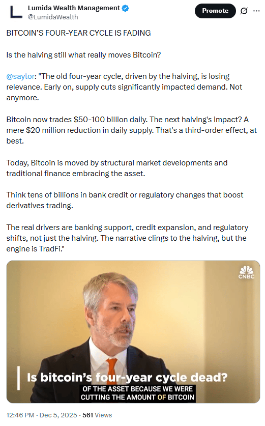Michael Saylor argues the halving no longer drives Bitcoin’s behavior: structural credit, derivatives growth, and TradFi adoption now set the real market cycle.