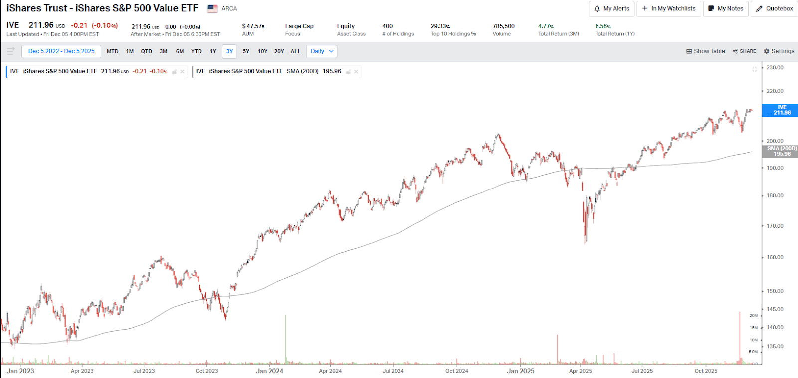 The S&P 500 Value ETF (IVE) ended this week near its All time highs, showing a strong recovery post its low in November.
