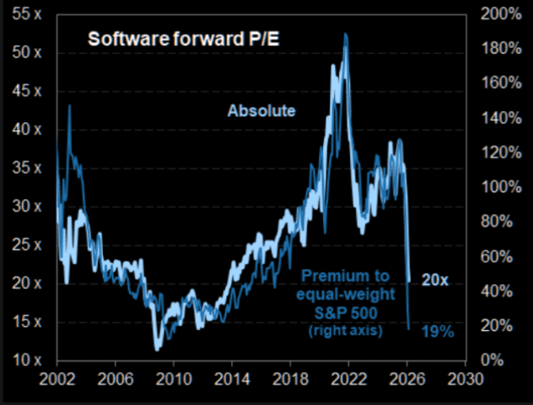 Software valuations have de-rated sharply on price-to-sales, falling from roughly 9x in September 2025 to about 6x today. This places the sector around the middle of its historical range since 2010.