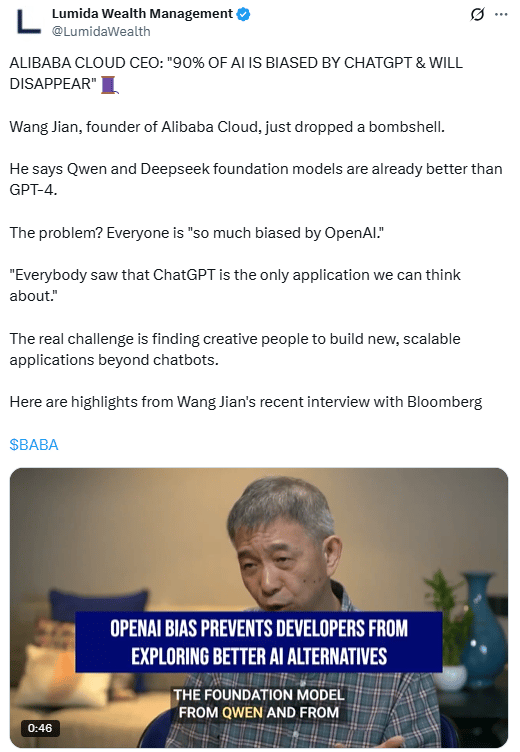 Alibaba Cloud’s founder ignites debate, claiming OpenAI’s dominance is stifling innovation and that Chinese models like Qwen and Deepseek are already ahead.