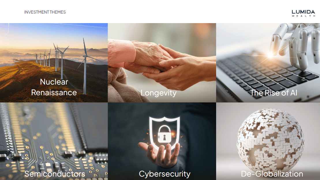 The information in this material has been obtained from sources believed to be reliable. While all reasonable care has been taken to ensure that the facts stated in this material are accurate and that the forecasts, opinions and expectations contained herein are fair and reasonable, Lumida, Inc. and Lumida Wealth Management LLC (collectively Lumida) make no representations or warranties whatsoever the completeness or accuracy of the material provided, except with respect to any disclosures relative to Lumida. Accordingly, no reliance should be placed on the accuracy, fairness or completeness of the information contained in this material. Any data discrepancies in this material could be the result of different calculations and/or adjustments. Lumida accepts no liability whatsoever for any loss arising from any use of this material or its contents, and neither Lumida nor any of its respective directors, officers or employees, shall be in any way responsible for the contents hereof, apart from the liabilities and responsibilities that may be imposed on them by the relevant regulatory authority in the jurisdiction in question, or the regulatory regime thereunder. Opinions,forecasts or projections contained in this material represent Lumida’s current opinions or judgment as of the day of the material only and are therefore subject to change without notice. Periodic updates may be provided on companies/industries based on company-specific developments or announcements, market conditions or any other publicly available information. There can be no assurance that future results or events will be consistent with any such opinions, forecasts or projections, which represent only one possible outcome. Furthermore, such opinions, forecasts or projections are subject to certain risks, uncertainties and assumptions that have not been verified, and future actual results or events could differ materially. The value of, or income from, any investments referred to in this material may fluctuate and/orbe affected by changes in exchange rates. All pricing is indicative as of the close of market for the securities discussed, unless otherwise stated. Past performance is not indicative of future results. Accordingly, investors may receive back less than originally invested. This material is not intended as an offer or solicitation for the purchase or sale of any financial instrument. The opinions and recommendations herein do not take into account individual client circumstances, objectives, or needs and are not intended as recommendations of particular securities, financial instruments or strategies to particular clients. The recipients of this material must make their own independent decisions regarding any securities or financial instruments mentioned herein and should seek advice from such independent financial, legal, tax or other adviser as they deem necessary. Lumida may trade as a principal on the basis of its views and research, and it may also engage in transactions for its own account or for its clients’ accounts in a manner inconsistent with the views taken in this material, and Lumida is under no obligation to ensure that such other communication is brought to the attention of any recipient of this material. Others within Lumida may take views that are inconsistent with those taken in this material. Employees of Lumida not involved in the preparation of this material may have investments in the financial instruments or securities (or derivatives of such financial instruments or securities) mentioned in this material and may trade them in ways different from those discussed in this material. This material is not an advertisement for or marketing of any issuer, its products or services, or its securities in any