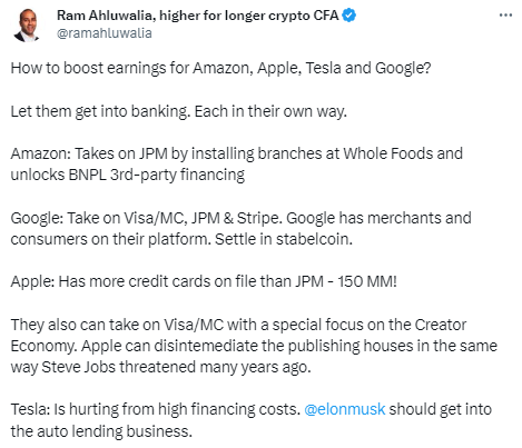 Also, here’s a twitter thread showing how the Big Tech firms, including Apple, can jumpstart earnings by getting into the banking sector.