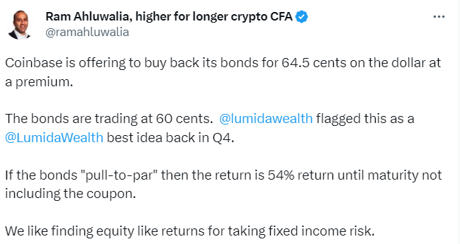 Coinbase offered to buy its bonds for 65 cents on the dollar. Check our thread here. After we published this the offers on the bonds increase to 71 cents on the dollar.