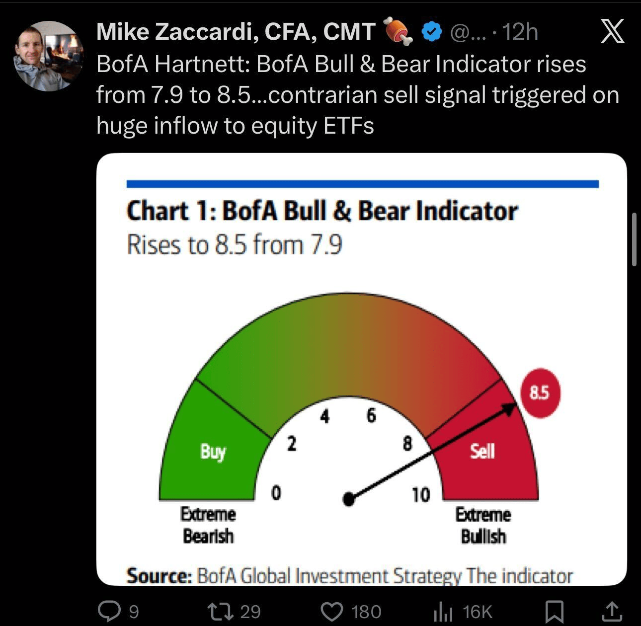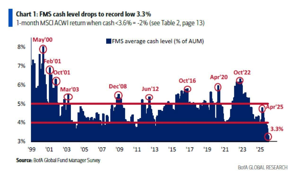 Cash levels in the BofA Global Fund Manager Survey have fallen to a record low ~3.3%, which tells you something simple and uncomfortable: investors are already all-in.