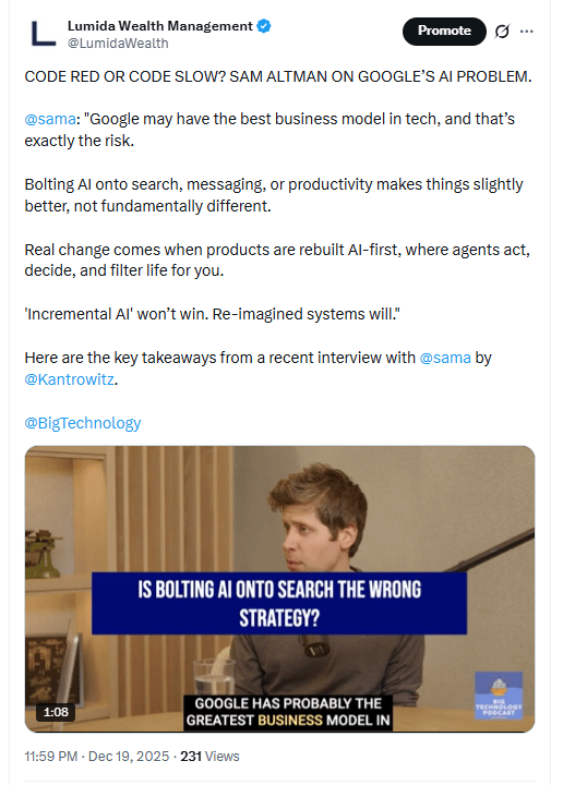 Sam Altman argues that simply bolting AI onto search won’t be enough for Google. Real disruption comes from rebuilding products AI-first, where agents don’t just assist, but decide.