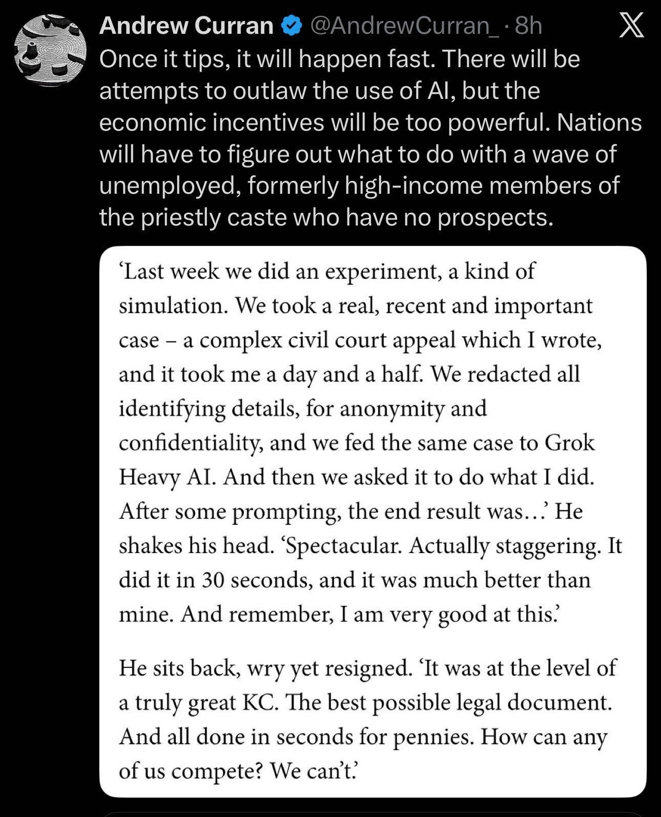 This is an interesting post from a lawyer citing how AI crushed him at preparing a long legal brief.