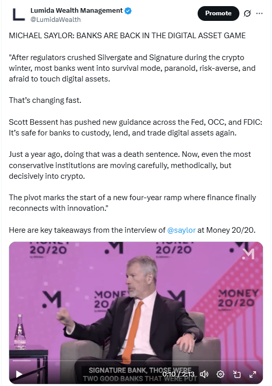 Michael Saylor says new regulatory clarity from the Fed, OCC, and FDIC is ushering traditional banks back into digital assets, signaling a fresh wave of institutional adoption.