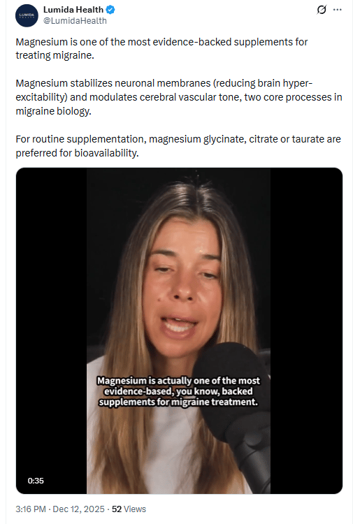One of the most evidence-backed supplements for migraine, magnesium works by calming neuronal excitability and improving cerebral blood flow, targeting the biology of migraines at the root.