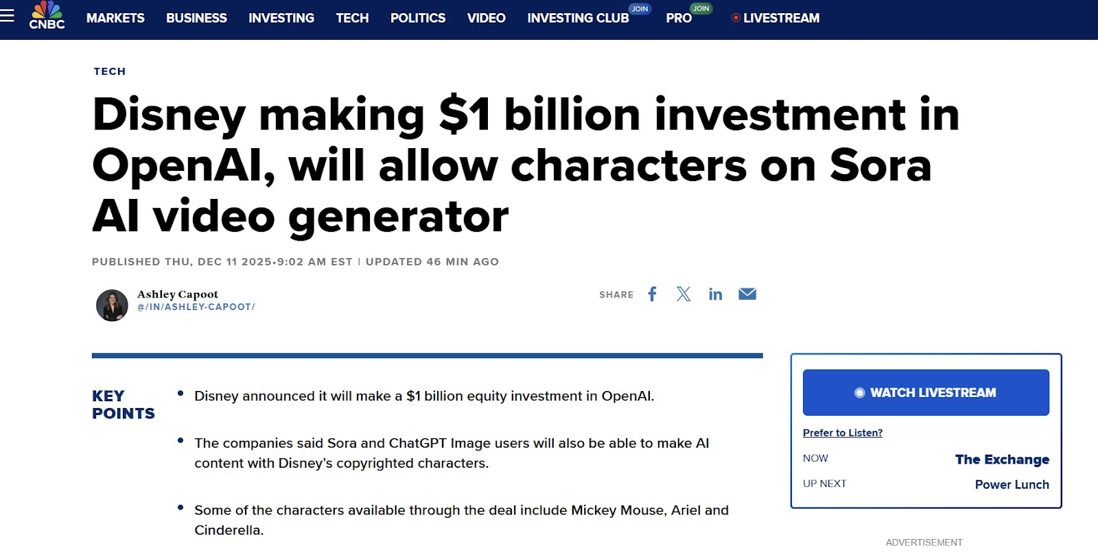 Disney announced that it is investing $1 Bn in OpenAI, and will use OpenAI's APIs.