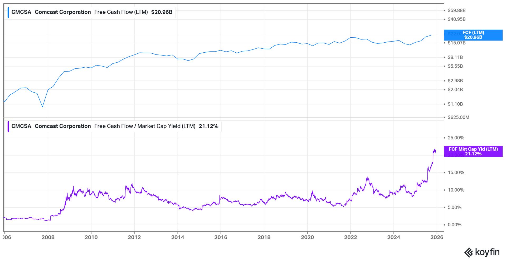 But unlike peers like Charter (CHTR), Comcast pairs connectivity with content optionality, trading at a lower PE (~4.5x vs 5.7x) and generating a 21% free cash flow yield—roughly five times what it spends on buybacks.