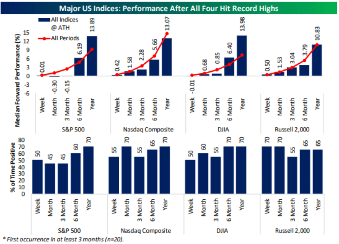 To add to the above data point, this week, we also saw Russell2000, NASDAQ, S&P500, and DJIA, hitting new highs together.