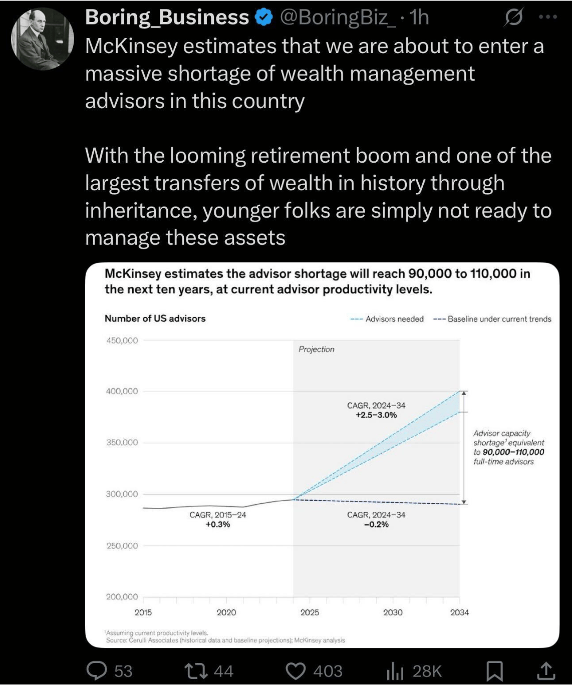 The U.S. faces a ~90k–110k advisor shortfall over the next decade just as Boomers retire and a historic wealth transfer accelerates. The gap won’t be filled by call centers or model portfolios.