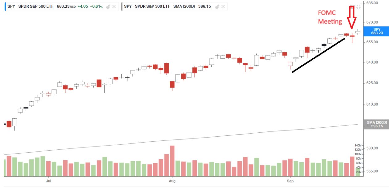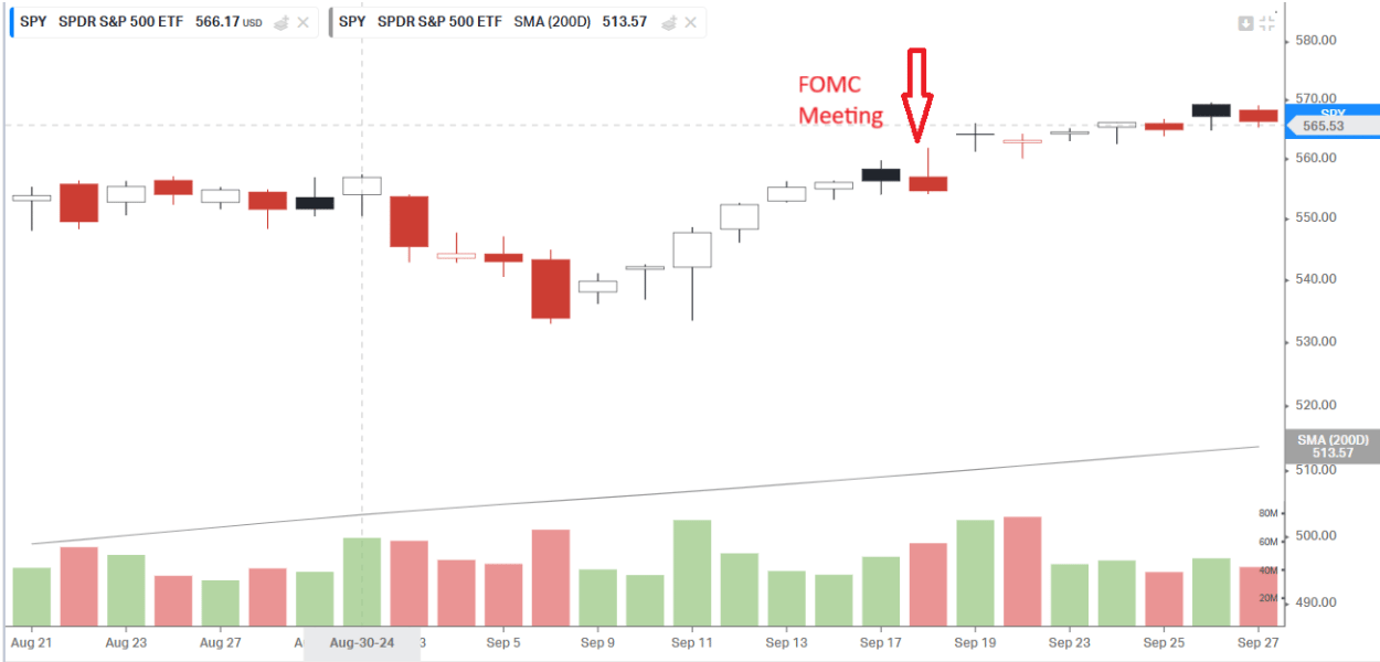 In Sept ’24 and Sept ’25, SPY rallied into the FOMC, wobbled on the announcement, and then firmed up.
