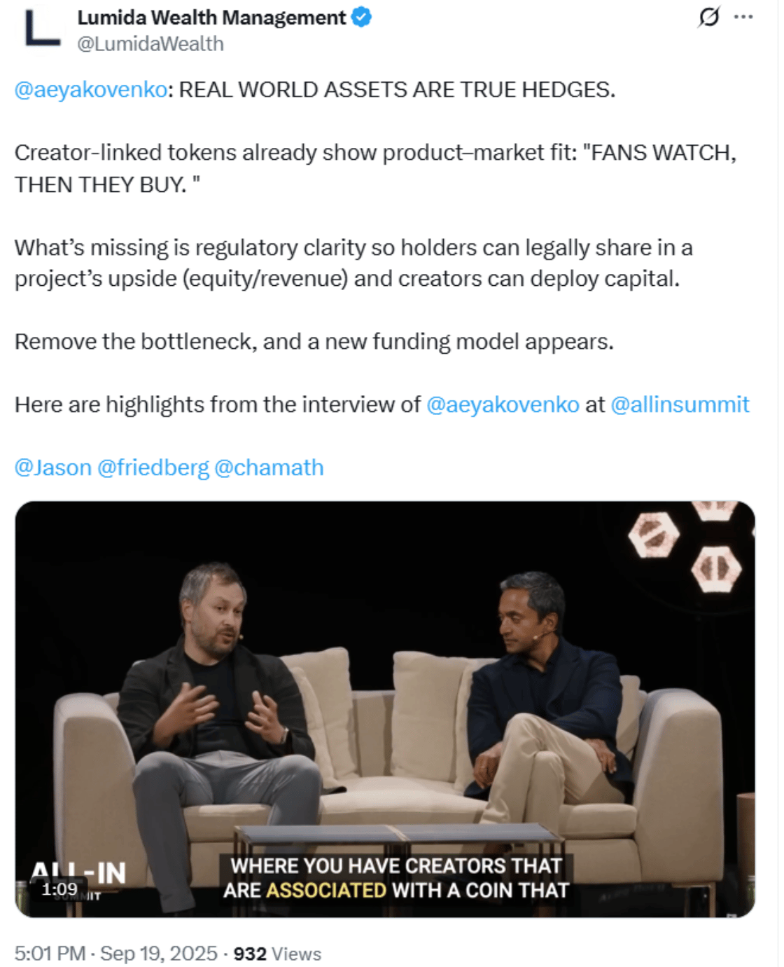 Solana’s Anatoly Yakovenko explains why real-world assets and creator-linked tokens could unlock a new funding model once regulatory clarity is achieved.