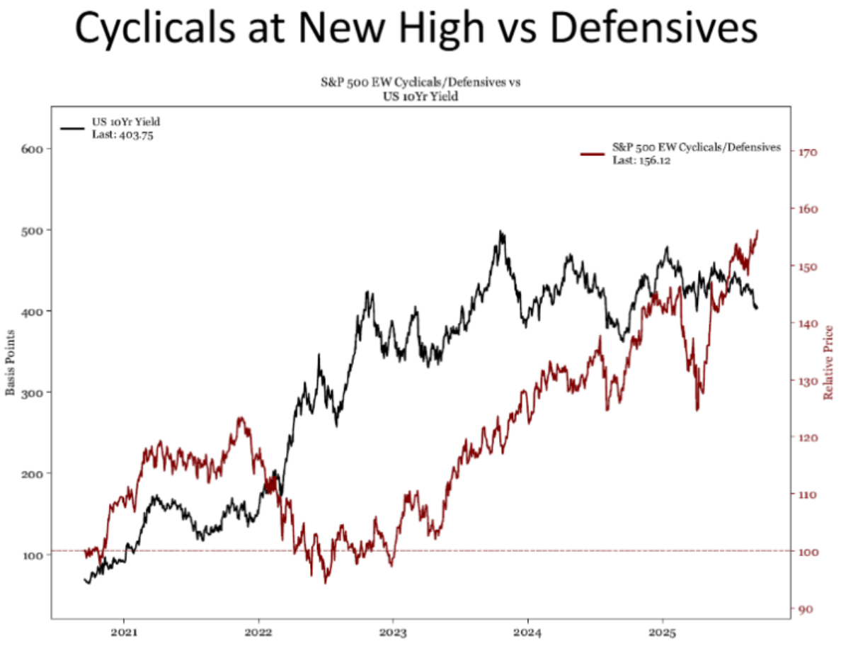 Cyclical stocks are outperforming defensives. The equal-weight ratio of cyclicals to defensives has reached a new high.