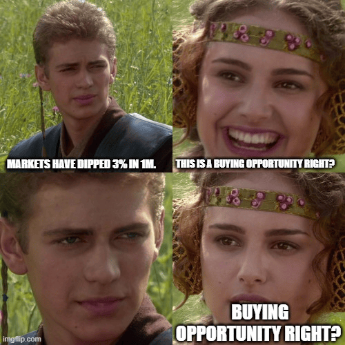The investor who buys the first fear spike is underwater within days as the dip keeps dipping.