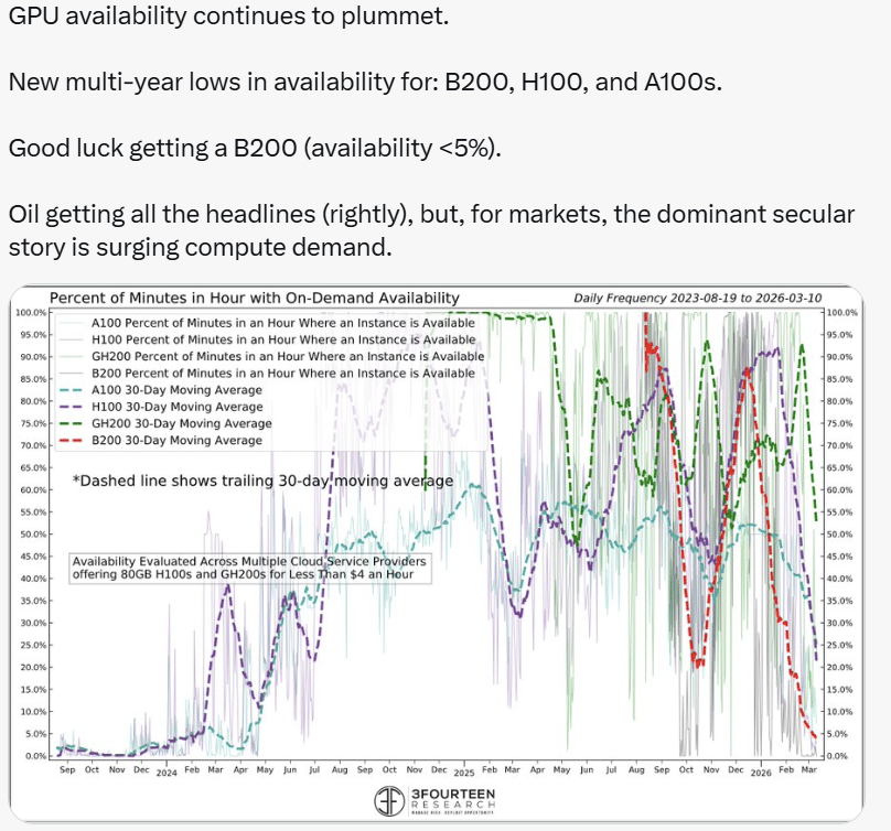 GPU availability across cloud service providers has hit multi-year lows. B200s, H100s, and A100s are all in steep decline.