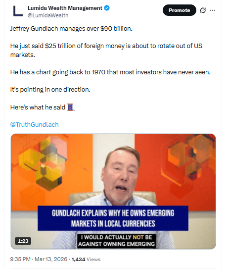 Jeffrey Gundlach argues a historic shift may be coming as foreign capital that flooded U.S. markets for decades begins rotating toward emerging markets and local-currency assets.