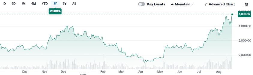 It rocketed to $4,866.73 on August 22, leaping 15% in a single day.