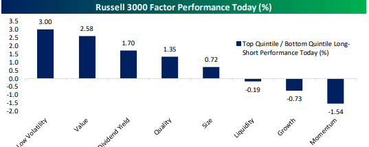 Low-volatility stocks significantly outperformed high-momentum growth stocks, gaining over 2.5%.