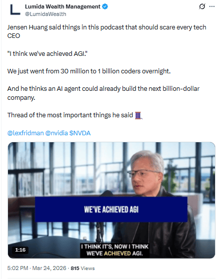 On Lex Fridman's podcast, Nvidia's Jensen Huang made three statements that should stop every tech CEO in their tracks: AGI has already been achieved, the global coder base just expanded from 30 million to 1 billion overnight, and an AI agent could already build the next billion-dollar company.