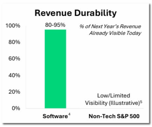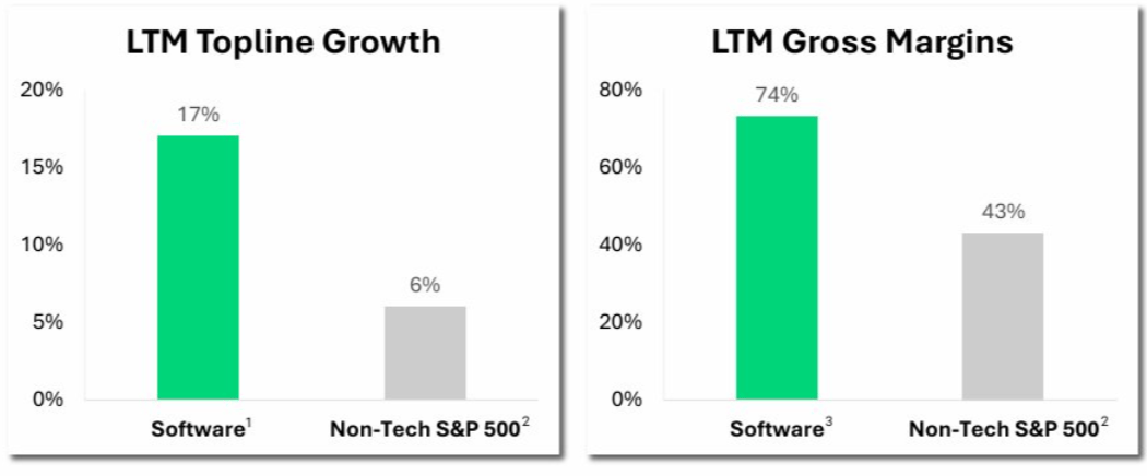 Software companies grew revenue at 17% last year. The rest of the S&P 500 grew at 6%. Gross margins in software run at 74% versus 43% for the broader index.