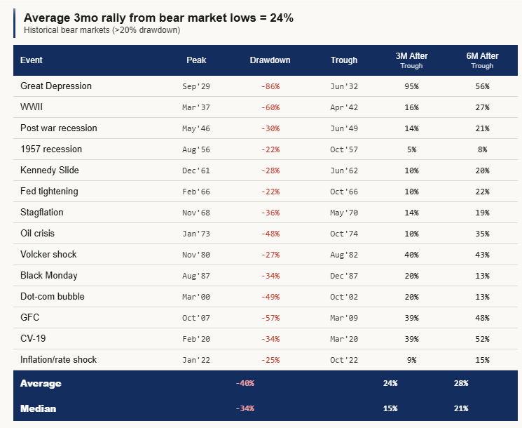 The average three-month rally from bear market lows across every major historical drawdown is 24%. The median is 15%.