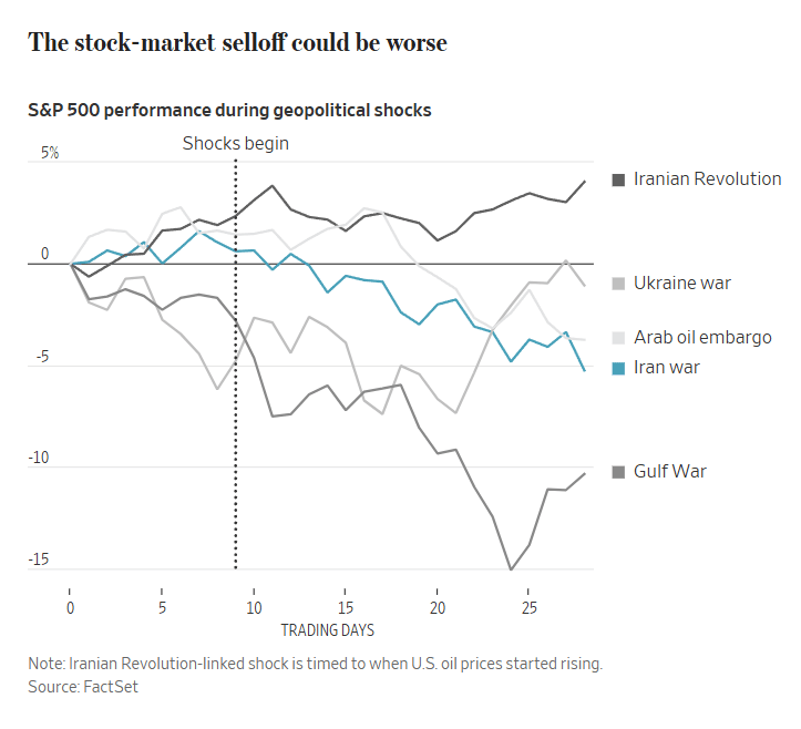 The current Iran conflict has tracked more like Ukraine — painful but not catastrophic, sitting in the minus 4 to 6% range at this stage.