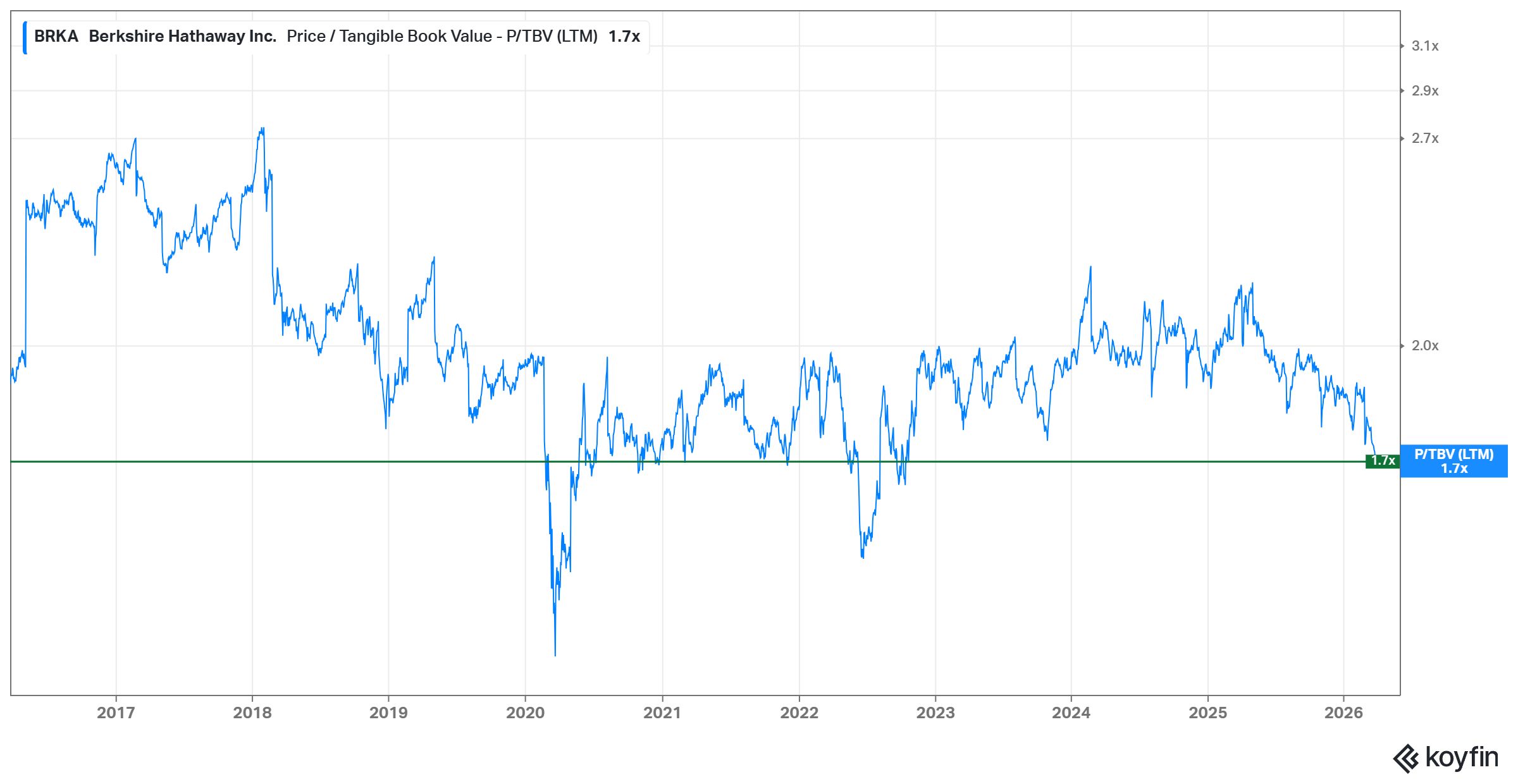 Here is a chart of the price to tangible book value of Berkshire: