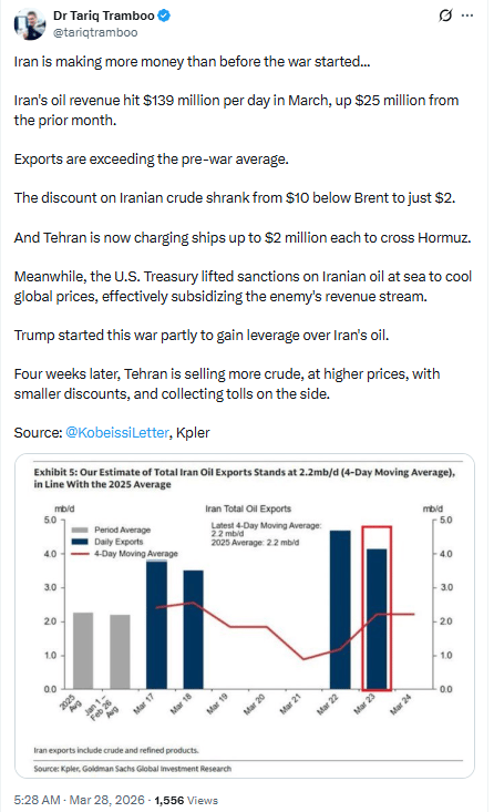 Note: Iran is making more money selling oil than ever before. This conflict is profitable for Iran. People respond to incentives.