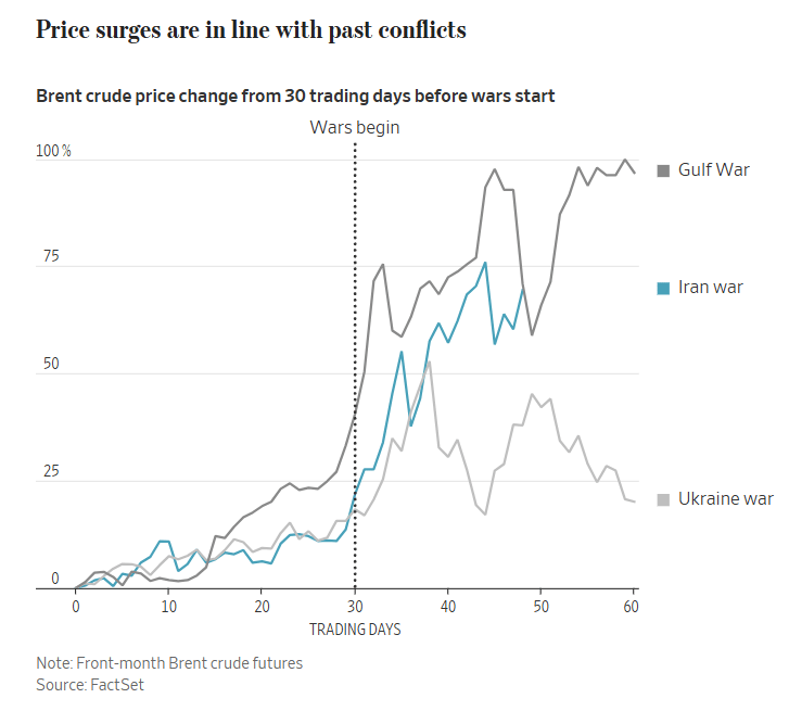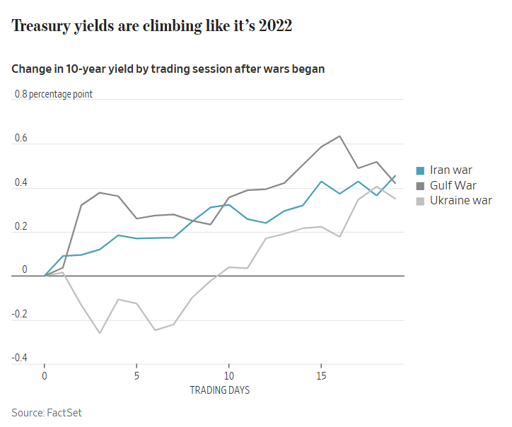 Ten-year Treasury yields have risen nearly 40 basis points since the conflict began, tracking the Gulf War trajectory almost exactly.