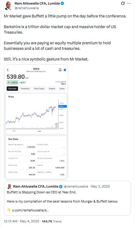 Now, I believe Berkshire is a ‘stalk’. We built a 2% position on Friday. If markets capitulate, and that’s a real possibility, the name could re-test October 2022 valuation lows in which case I would build a large position.